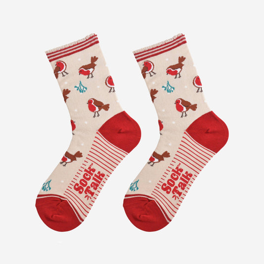Women's Bamboo Socks - Cream/Red, Christmas Robin