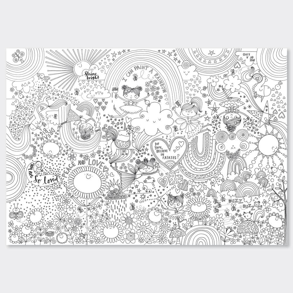 A new addition to our popular colouring book range, colouring posters for hours of fun and mindfulness! Printed on a sturdy material in a 1000mm x 700mm size, these are large enough to be worked on by more than one child at a time, whether on the floor, on the back of a door or on a table, they could even be used as table cloth afterwards! Packaged folded in a neat, cardboard wallet with a Euro hook. This design features magical unicorns, fairies and rainbows.