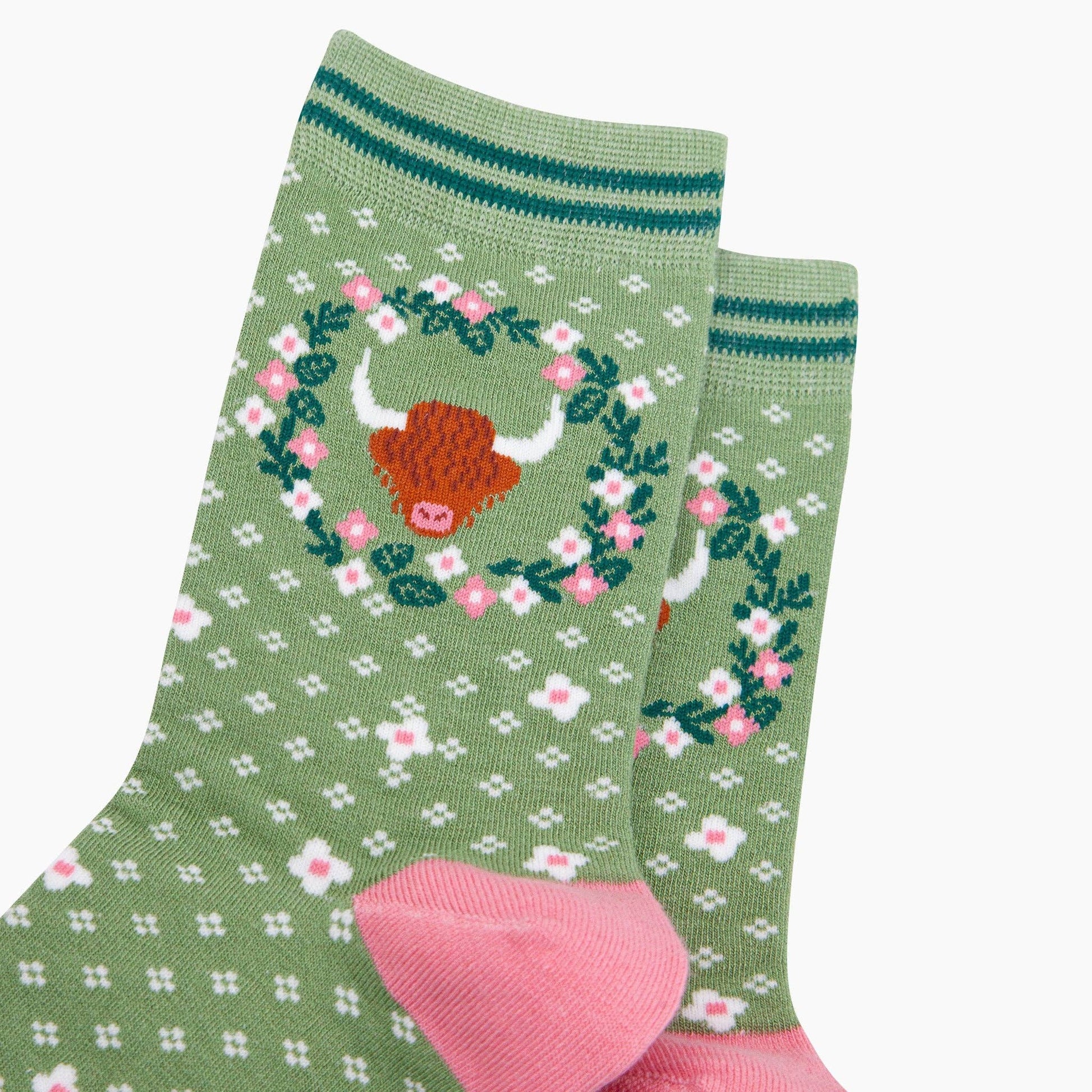 Highland Cow Floral Wreath Bamboo Socks in Green