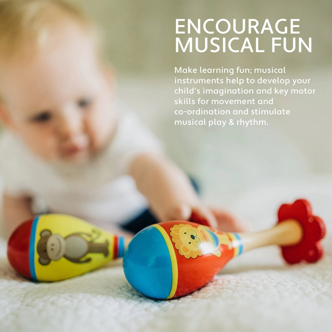 This Lion & Monkey Maraca Set is the perfect way to get your little one jamming! They'll love the bright colors and the fun sound that each wooden maraca makes as they shake them. Plus, introducing music early might have them leading their own band in no time! Play on!