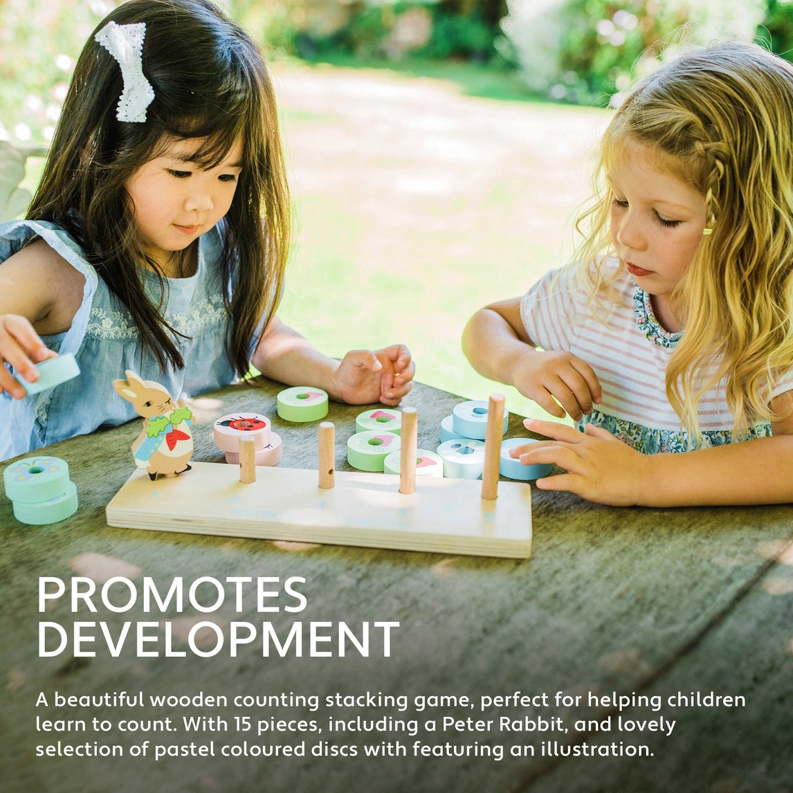 A beautiful wooden counting stacking game, perfect for helping children learn to count. With 15 pieces, including a Peter Rabbit, and lovely selection of pastel coloured discs with featuring an illustration.