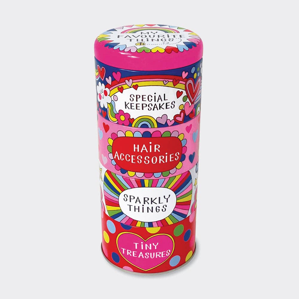 Brilliant for organising and storing small bits and bobs, this 'My Favourite Things' themed stacking tin consists of four individual tins that slot into one another with a lid on top. The tins are both pretty and practical, with each one featuring a different caption such as 'Special Keepsakes' and 'Hair Accessories'. SIZE: Total height is 198mm, each tin is 85mm in diameter/45mm in height.